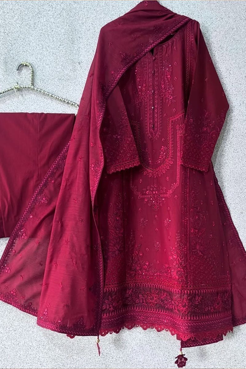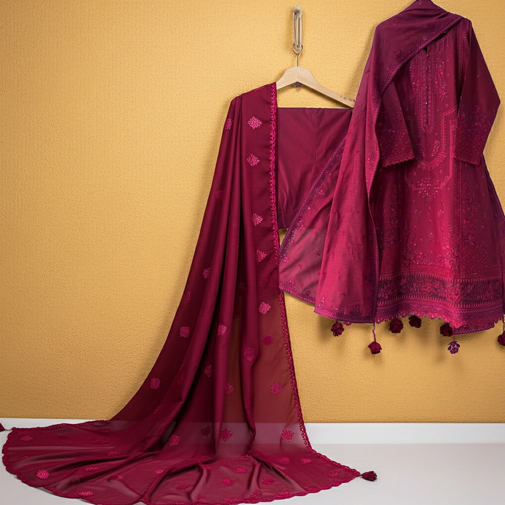 This is a premium stitched 3-piece Dhanak embroidered dress designed for elegance and comfort. The shirt features a finely embroidered front and sleeves, showcasing intricate craftsmanship. The organza embroidered daman adds a graceful touch, while the dhanak dupatta is beautifully embroidered on all four pallu sides for a complete luxurious feel. Perfect for festive occasions or formal gatherings, this outfit blends traditional charm with modern style. Paired with a comfortable plain trouser, it offers a perfect balance of sophistication, quality, and timeless beauty for your wardrobe.